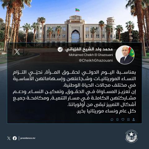 تقدم الرئيس محمد ولد الغزواني بأسمى عبارات التهاني، إلى النساء الموريتانيات، بمناسبة اليوم العالم