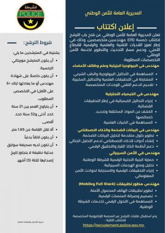 أعلنت المديرية العامة للأمن الوطني عن فتح باب الترشح لاكتتاب خمسة مهندسين متخصصين، في إطار تعزيز