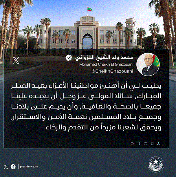 Son Excellence le Président de la République, Monsieur Mohamed Ould Cheikh El Ghazouani, a félicité ce jeudi le peuple mauritanien à l’occasion de l’Aïd al-Fitr.