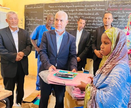 Le wali de l’Adrar, M. Abdallahi Ould Mohamed Mahmoud, a supervisé, mercredi à Atar, la distribution d’un lot de matériel scolaire comprenant 531 cartables aux élèves des écoles de la ville d’Atar, offert par la Fondation caritative de la SNIM en collaboration avec la commune d’Atar.