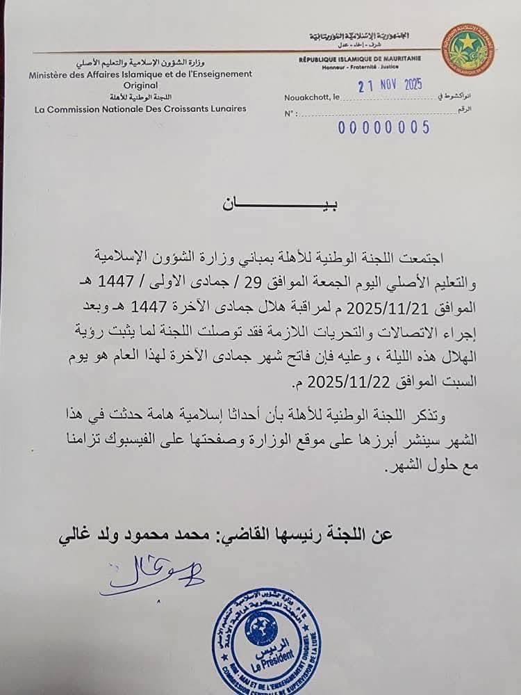 وقالت اللجنة في بيان عقب اجتماعها مساء الجمعة إن فاتح هلال شهر جمادي الآخرة سيكون السبت الموافق لل22 نوفمبر