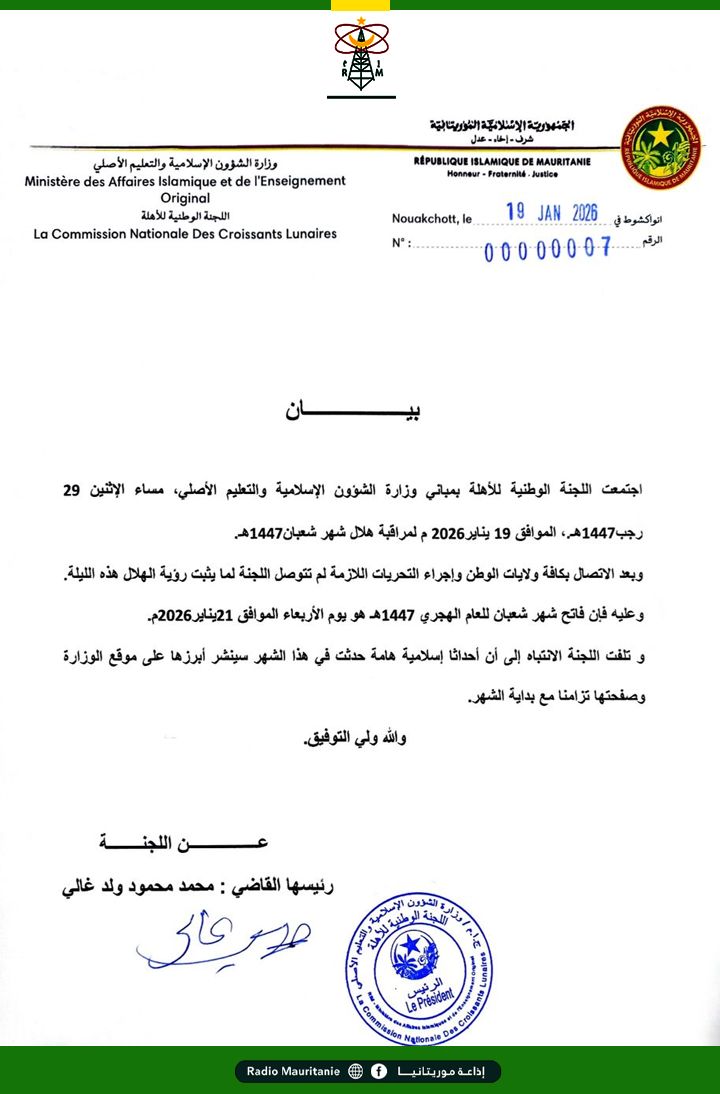 وأوضحت اللجنة، في بيان صحفي، أنه بعد الاتصال بكافة ولايات الوطن، وإجراء التحريات اللازمة خلال الاجتماع الذي عقدته مساء اليوم الإثنين بمباني وزارة الشؤون الإسلامية والتعليم الأصلي، لم يثبت لديها رؤية هلال شهر شعبان هذه الليلة