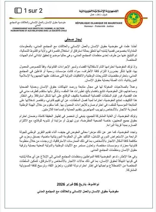 قالت مفوضية حقوق الإنسان والعمل الإنساني والعلاقات مع المجتمع المدني إنها أخذت علما بالمعلومات المتداولة بشأن قضية يشتبه أنها تتعلق بحالة استرقاق أو استغلال قاصرة في ولاية نواكشوط الشمالية، تم التبليغ عنها من طرف إحدى منظمات المجتمع المدني، وتخضع حاليا لتحقيق ابتدائي لدى الجهات المختصة.
