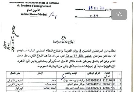 وجهت وزارة التربية وإصلاح النظام التعليمي إنذارا إلى 17 مدرّسًا لعدم التحاقهم بمقار عملهم، محددة مهلة 72 ساعة للعودة إلى وظائفهم أو تقديم مبررات قانونية تثبت وجود قوة قاهرة.