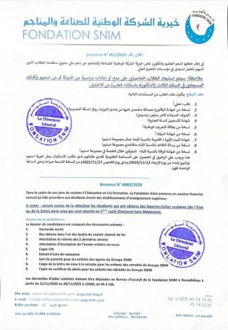 أعلنت خيرية الشركة الوطنية للصناعة والمناجم اسنيم، عن فتح باب الترشح للاستفادة من الدعم السنوي لطلاب التعليم العالي الحاصلين على الباكلوريا في إحدى المدن المحاذية للسكة الحديدية، بما فيها انواذيبو وازويرات.