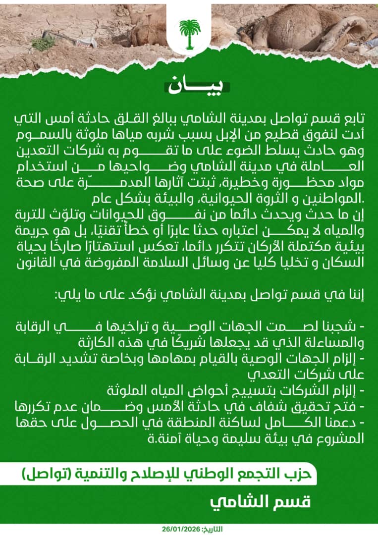 وقال قسم تواصل في الشامي إن القطيع نفق إثر شربه من مياه ملوثة بالسموم، مضيفا أن الحادث يسلط الضوء على ما تقوم به شركات التعدين العاملة في مدينة الشامي وضواحيها من "استخدام مواد محظورة وخطيرة، ثبتت آثارها المدمّرة على صحة المواطنين والثروة الحيوانية، والبيئة بشكل عام".