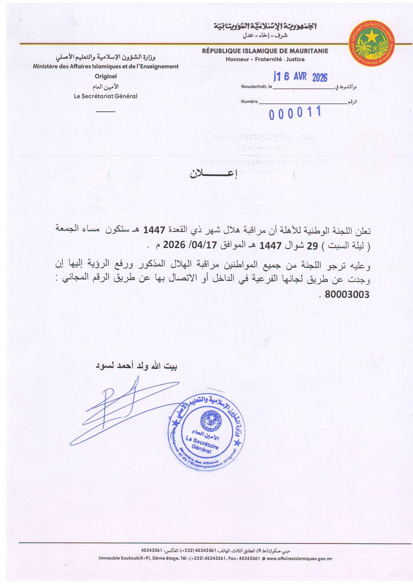 أعلنت وزارة الشؤون الإسلامية والتعليم الأصلي في موريتانيا أن اللجنة الوطنية للأهلة ستتحرى هلال شهر ذي القعدة لعام 1447 هـ مساء الجمعة، الموافق 17 أبريل 2026.